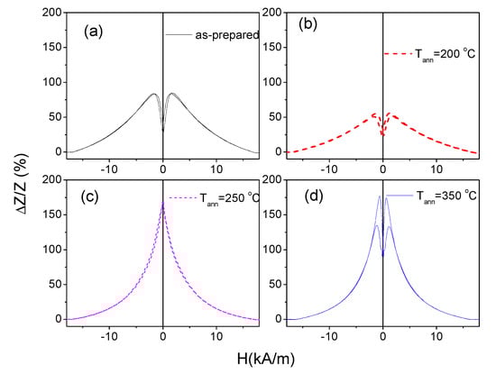 Moreover, annealing affects not only the ΔZ/Zm values, but also the shape of ΔZ/Z(H) dependencies: as-prepared exhibits double-peak ΔZ/Z(H) dependence (see Figure 3a). However, a noticeable modification of the ΔZ/Z (H) dependencies can be appreciated upon annealing: For the samples annealed at Tann = 200 and 350 °C, ΔZ/Z(H) dependencies still present a double-peak shape. However, the magnetic field at which the maximum on ΔZ/Z(H) dependence takes place, Hm, becomes lower than that for the as-prepared sample (Hm ≈ 1.7 kA/m for as-prepared sample, Hm ≈ 1.2 kA/m for Tann = 200 °C and Hm ≈ 0.7 kA/m for Tann = 350 °C; see Figure 3a,b,d).