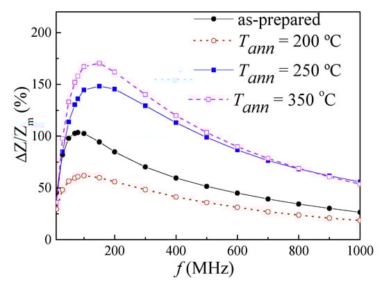 As can be observed from Figure 5, the evolution of ΔZ/Zm upon annealing is not restricted to 200 MHz: Surprisingly, higher ΔZ/Zm values for Tann = 250 and 350 °C are observed in a wide frequency range. Previously, decreasing of the GMI ratio in annealed Co-rich microwires presenting with annealing-induced magnetic bistability has been reported [39]. However, systematic studies have not been conducted.