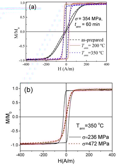 Effect of Tann, for σ = 354 MPa (a) and effect of σ for Tann = 350 °C (b), on hysteresis loops of studied samples.