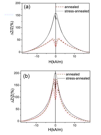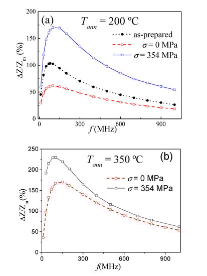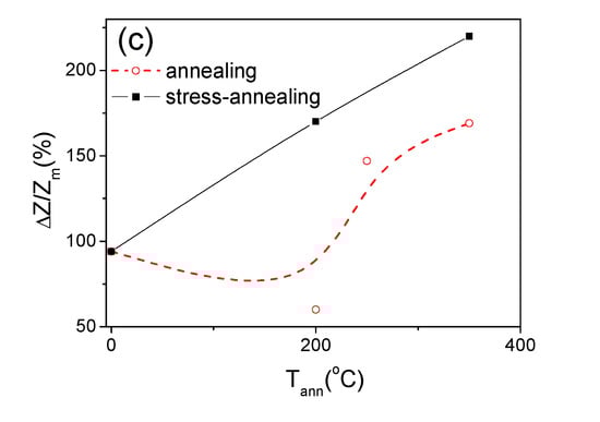 A more remarkable influence of stress-annealing can be appreciated from Figure 8c, where ΔZ/Zm(Tann) dependence evaluated for f = 150 MHz for annealed and stress-annealed samples is shown. ∆Z/Zm varies from 94% for as-prepared up to 220% for stress-annealed.