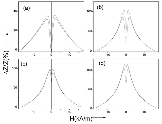 Accordingly, the magnetic field dependence of the GMI effect is determined by the magnetic field dependence of magnetic permeability, and hence by the type of magnetic anisotropy [17,18,19,20,21,22,23,24,25]. Commonly, the GMI effect is represented by the GMI ratio, ΔZ/Z, which is defined as follows: