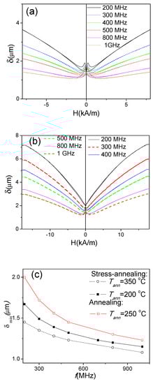 The frequency dependence of the minimum penetration depth, δmin, evaluated from Figure 10a,b, shows a decrease with f rising. The sample stress-annealed at Tan = 200 °C presents similar δmin (f) dependence, with slightly higher δmin values (see Figure 10c): In both stress-annealed samples, δmin values near 1–1.2 μm can be observed at high frequencies. Finally, the sample annealed without stress presents slightly higher δmin values, of about 1.3 μm.