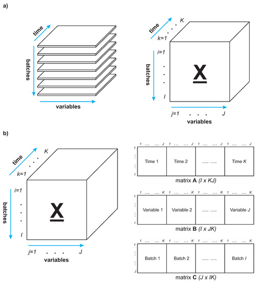 Graphical representation of methods to unfold a three-dimensional data matrix: (a) Three-dimensional data matrix of a batch process. (b) Unfolding methods of a three-dimensional data matrix.
