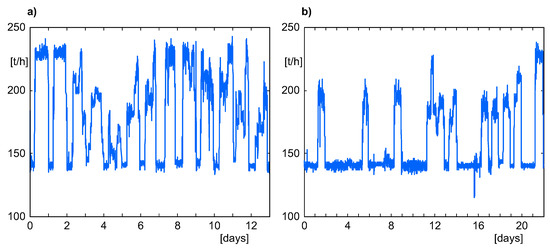 It should be emphasized that the power or steam generation processes are rather far from being typical batches; they rather belong to the group of nonlinear, nonstationary processes. The boiler operating point (which obviously influences daily profiles of steam quantities) is set manually by the operator, due to seasonal and daily demands, the loads of other boilers cooperating with the considered one and (to some extent) the abilities of the thermal-electrical power plant to accumulate energy. That is why (e.g., in a monthly period) daily profiles of steam production sometimes vary substantially, depending on variability of demands on co-generated heat and electricity. That is clearly visible in Figure 3, where the profiles of steam load in the periods just before two shutdowns described as the case studies, which took place on 04.12.2011 (Figure 3a) and 13.01.2014 (Figure 3b), are presented. However some similarities between daily profiles of process variables exist which justified our trials to employ the MPCA method to detect symptoms of pipeline leakages. It turned out (this will be discussed in detail below) that in such difficult conditions, the MPCA method was able to detect developing leakages in advance, providing the process operator sufficient time to undertake appropriate actions.