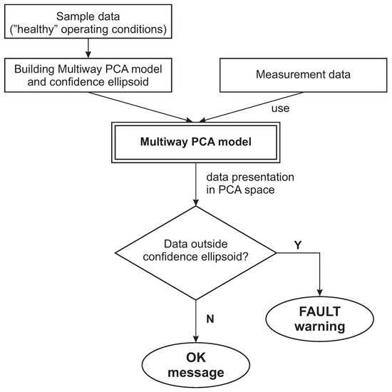 The points representing normal batches, which were used to develop the MPCA model, were then mapped on the coordinate system created from three principal components (scores) of the largest contribution. The region containing 95% of such mapped points may be bounded by an ellipsoid, which is considered the confidence region (control limit). The location of the center and the size of the ellipsoid represent the mean and the covariance of the mapped data used for development of the MPCA model. The mapped data points located inside the ellipsoid represent the “healthy” operating conditions of the boiler pipeline system. During the monitoring phase, the newly collected batch (representing the last daily segment of process variables) is normalized and mapped to the principal components coordinate system. The location outside the confidence ellipsoid is the indicator of possible fault appearing in the pipeline system. The finding may be also supported by the results of comparison of the values of Hotelling’s T (Equation (11)) and SPE (Q) statistics (Equation (14)) with their thresholds given by Equations (12) and (15), respectively. The block diagram of the detection scheme is presented in Figure 4.