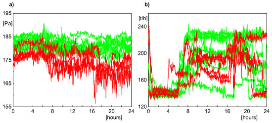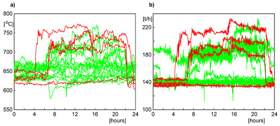 In the numerical experiments, we used the data segment recorded between 22nd December 2013 and 13th January 2014 to build the MPCA model and check its ability to detect the leakage three days earlier than the emergency shutdown. In that case, the number of batches was bigger than in the previous case, as the period of an uninterrupted and relatively stable operation of the boiler (which could be considered as the “healthy” period) lasted for 19 days. However, the variability of the shapes of process variables was still significant, as is shown in Figure 8 for two process variables (the temperature of fumes in the left channel and the flow of water feeding the boiler). As in Figure 5, the batches used for building the MPCA model are shown in green color, while those considered as faulty (and employed to check the detection ability of the model) are shown as thick red lines.