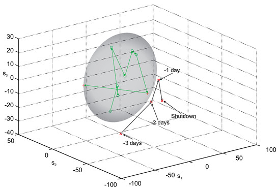 Figure 10 presents the results of leakage detection with the use of the MPCA model created from the subset of five variables, selected experimentally from the full set of 12 process variables. As in Case 1, the MPCA model in the principal component (PC) space spanning the largest three PCs, was used to obtain the confidence ellipsoid. The circles in Figure 10 represent the points (batches) which lay within the confidence ellipsoid, bounding the area occupied by “healthy” data. The thin green dotted line represents the “healthy” process trajectory, constructed from the representation of the consecutive batches, projected on the reduced three-dimensional PC space. The crosses correspond to batches placed outside the ellipsoid, and the graphite thick solid line represents the fault trajectory. The fault trajectory is the representation of the last four batches (which precede the moment of the boiler shutdown) in the PC space.