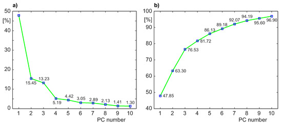 Explanation of the selection of the principal components which create the MPCA model: (a) Scree plot—percent of variance captured by the first 10 principal components. (b) Accumulated contribution rate cr for the first 10 principal components.