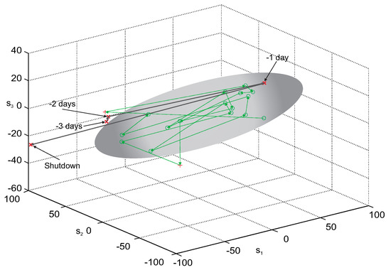 Figure 6 presents the results of leakage detection with the use of the MPCA model created from the experimentally selected set of five process variables, decomposed by MPCA. The MPCA model in the principal component (PC) space spanned by the largest three PCs, was used to obtain the confidence ellipsoid, which bounds the area corresponding to “healthy” data. The circles in Figure 6 represent the points (batches) which lay within the confidence ellipsoid, while all the crosses correspond to batches placed outside the ellipsoid. The thin green dotted line represents the “healthy” process trajectory, constructed from the representation of the consecutive batches, projected on the reduced three-dimensional PC space. The graphite solid line represents the fault trajectory; i.e., the representation of the last four batches (which precede the moment of the boiler shutdown) in the PC space.