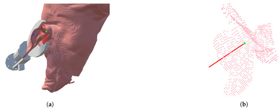 (a) Correct tool pose illustrated using 3D models of the tool and pig. (b) A point cloud of the ear region with our representation of a 5-DoF cutting plane consisting of (green) and (red).