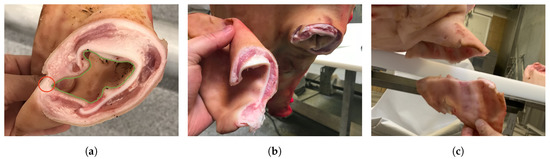 An optimal cut is highly dependent on the anatomy of the individual ear. The cut must be roughly parallel to the head and far enough away such that the ear canal is separated. A borderline acceptable result is shown in Figure 2a. Here, the ear canal, outlined in green, is still connected by skin. Ideally, the area marked by a red circle would be left on the head. Figure 2b shows a good cut where this is the case, and Figure 2c shows a terrible cut, where much the valuable ear is left on the head.