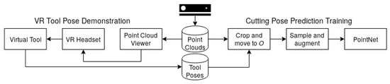 Our pose prediction framework can be considered as two separate systems: a training system for collecting point cloud and tool pose pairs as well as learning a mapping from the point cloud to tool pose; another system for performing inference based on the learned mapping and sending actionable 6-DoF poses to a robot equipped with the cutting tool. Both systems share several of the same components, but also include components that are only relevant to the given system’s task. In this section, we describe details of the components that make up the two systems. The components involved in the training system and the inference system are shown in Figure 3 and Figure 4, respectively.