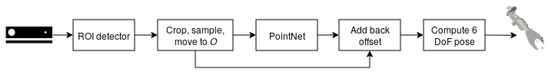 The inference system could not rely on annotations for determining a Region Of Interest (ROI) and thus needed an ROI detector. An off-the-shelf bounding box detector served this purpose. At inference time, the translation offset used to center the point cloud crop around O was added back, such that the position prediction was placed correctly in the world. Finally, the 6th undetermined DoF was computed in relation to the robot. In the following, we describe theses subsystems in more detail.