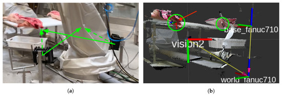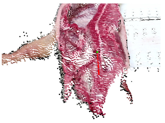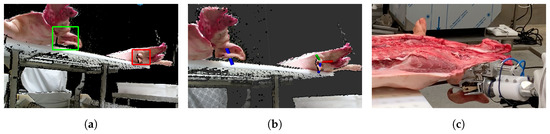 The system relied on point clouds captured by a Kinect V2. With its time-of-flight technology and advanced ambient light compensation, it has long been the superior choice in terms of resolution, robustness, and accuracy. This is however quickly changing with its discontinuation and the wealth of new sensors becoming available. One promising candidate for its replacement is its successor, the Azure Kinect, which improves on Kinect V2 in most regards. For this work, point clouds were captured in their native resolution of 512 × 424 using the IAI Kinect2 ROS package [33]. The camera setup is shown in Figure 5a,b. Two cameras were mounted on the floor, one on each side of the robot. Both ears, marked by circles in Figure 5b, were mostly visible in either camera; however, the placement and softness of the pigs varied, and there was a risk of self-occlusion of vital parts. Specifically, the base area of the ear might be occluded. This was somewhat the case with the nearest ear in Figure 5b, where the snout, marked by the arrow, covers some of the ear.