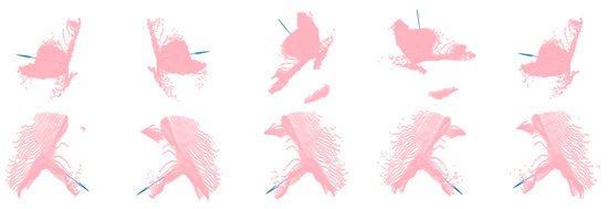From experience, visual information covering both sides of the ear is helpful for accurately determining where to place the cut. However, in this work, only a single point of view was used. The other camera was exclusively used to gather additional data and to keep the option for combining point clouds from multiple views open at a later stage. Figure 6 shows a selection of point cloud crops with arrows illustrating demonstrated cutting places. The top row consists of examples from the nearest ears, and the bottom row shows examples from the ears furthest away from the cameras. It was clear that the ears looked vastly different based on the view point. Additionally, they contained noisy depth measurements and artifacts along edges, and the points were unevenly distributed across the area of interest.