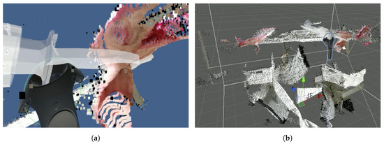 The programming by demonstration paradigm used with collaborative robots has lowered the difficulty of robot programming significantly. The same paradigm can be used to train robots by Learning from Demonstration (LfD). By utilizing mixed reality environments, these approaches become available for all types of robots. Using a HTC VIVE VR headset, point clouds were visualized, and an expert demonstrated the cutting poses. ROS# [40] was used as a bridge for transmitting point clouds to the Unity game engine [41], which interfaced with the VR headset. The VIVE controllers let the expert demonstrate cutting poses by grabbing a 3D model of the cutting tool. The tool was then placed at the appropriate location using the point cloud visualization as guidance. This process is shown in Figure 7a,b. The controller’s buttons allowed for saving cutting poses and switching between point clouds. VR is an intuitive interface for demonstrating tool poses [29], and its use is further justified and described in our prior work [42].