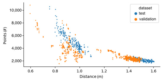 A strict requirement for using PointNet-style [30] neural networks is a fixed size input. This is usually achieved by sampling the required number of points from meshes, using the farthest point sampling. If a mesh is available, it enables the sampling of point clouds with arbitrary sizes [30]. Another example is random sampling, as used in [46], where 1024 points were sampled from 1200 points during both training and testing; this was done partly as an augmentation technique. Typically, the number of points lies in the range of 512–4096. In our case, a fixed number of points was acquired from the point cloud crops through random sampling. This simultaneously ensured that the point clouds looked similar independent of the range from which they were captured. To determine an appropriate number of points to sample, we looked at the minimum number of points in the point cloud crops. In Figure 9, the number of points in the crops is shown in relation to their distance from the camera. Examples from the training set were left out because they followed a similar distribution as the test set. Again, it was clear that the validation set was noticeably different and more varied.