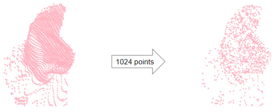(Left) Point cloud cropped from the sphere of interest. (Right) Random sampling of 1024 points.