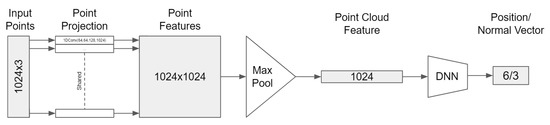PointNet was the basis for our architecture for regressing cutting poses from point clouds. We left out the STN module since invariance to geometric transformations was unwanted for pose prediction. The softmax activation functions were replaced by linear activations that output three values for either position or normal vector . The modified architecture is shown in Figure 11.