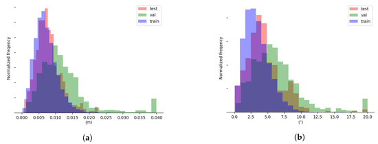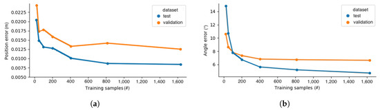 When evaluating model performance on the test set, the MAE was m for with a standard deviation of 0.004 m and ° for with a standard deviation of °. Table 2 shows the mean error for each of the three datasets.
