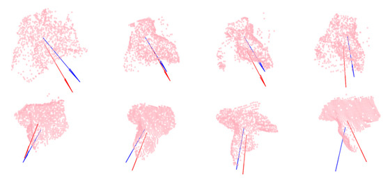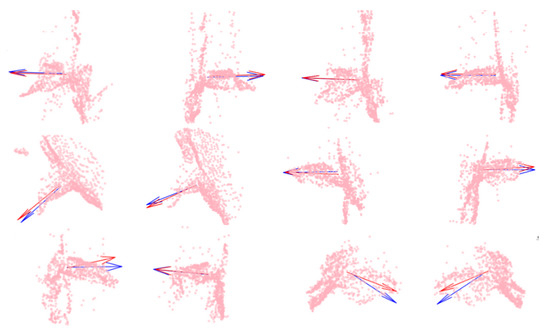 Test samples with arrows representing the demonstrated (blue) and predicted (red) cutting planes. (Top row) Samples with the smallest prediction error for . (Middle row) Samples with median prediction error for . (Bottom row) Samples with maximal prediction error for .