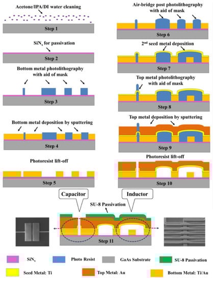 - Wang, C.; Lee, W.S.; Zhang, F.; Kim, N.Y. A novel method for the fabrication of integrated passive device on SI-GaAs substrate. Int. J. Adv. Manuf. Tech. 2011, 52, 1011–1018. [Google Scholar] [CrossRef]