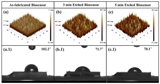 To enhance the sensitivity of the biosensor, a series of controlled dry etching processes based on Au layers were systematically carried out on the biosensor to investigate the effect between the roughness of surface and hydrophily hydrophobicity. Figure 4a–c presents the surface roughnesses of the top Au layers measured by atomic force microscope (AFM) which are as-fabricated and etched based on Cl2/Ar plasmas processing with 3 min and 5 min, respectively. The parameters of the Au dry etch process are shown in Table 1. As shown in Figure 4a, a smooth surface can be observed on the as-fabricated top layer with a root mean square (RMS) roughness of 2.03 nm. When the chip is treated with Cl2/Ar-based plasmas for 3 min, the quality of surface roughness of top layer is deteriorated to 12.3 nm, as depicted in Figure 4b. After dry etching for 5 min, there is no obvious change on the surface roughness showing a RMS of 13.2 nm. We can draw that the extra etching treatment, refering to over 3 min dry etching process, will not induce the Au roughness the deterioration any more after preliminary modification of the surface. Figure 4a.1–c.1 demonstrates the sessile drop data of glucose with 150 mg/dL on biosensor chip surface corresponding to above-mentioned three conditions. It can be observed that as-fabricated chip is highly hydrophobic with a glucose contact angle of ~102.2°. While the contact angle decreases to ~71.7°and ~70.1° after dry etching for 3 min and 5 min, respectively. The results show that the hydrophilicity of the biosensor increases as the surface roughness decreases, suggesting that the surface from hydrophobicity to hydrophilicity can be changed by the deteriorating surface roughness with plasma dry etching in order to promote the rate of fixation of glucose molecules and the resonance process.
