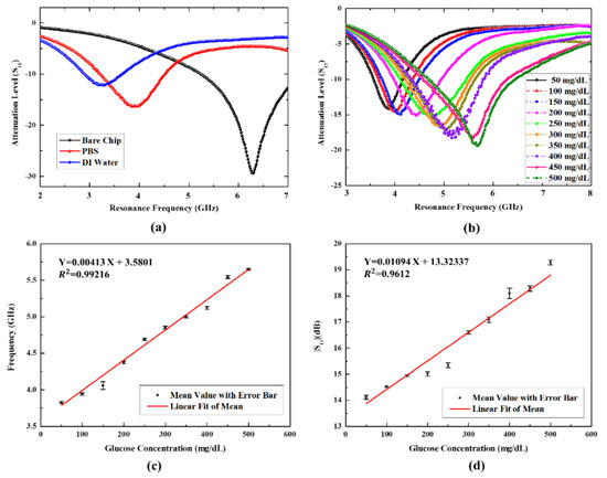 The responses of the proposed chip can be illustrated using RF parameters. In this work, we first measure the reflection coefficient and the resonance frequency under condition of the bare chip, the chip dropped using PBS solution, and the chip dropped using DI water, respectively. As shown in Figure 5a, the resonance frequency of bare chip is located at 6.30 GHz, and the other resonance frequencies revealed a downward shift with the instillation of PBS solution and DI water, which are located at 3.94 GHz and 3.30 GHz, respectively. Meanwhile, magnitudes of the reflection coefficient show an increasing variation ranging from −29.47 dB to −12.18 dB. The reasons for this can be explained as follows: the viscosity of DI water is lower than that of glucose solution and PBS, but conversely, the effective permittivity of DI water is greater than air, glucose solution, and PBS, resulting in the maximum frequency shift after dripping water onto the chip [51]. Then, a response experiment with different concentrations of glucose ranging from 50 mg/dL up to 500 mg/dL is explored. When the glucose solution is dropped on the surface of bare chip with increasing concentration, the resonance peaks regularly shift upward with an increasing of the magnitude of the reflection coefficient, as a result of the regular variation of effective permittivity, which is depicted in Figure 5b. It can be observed that the chip filled with glucose solution shows a tolerable resonance frequency shift in the range of 3.84–5.62 GHz accompanied with magnitude of reflection coefficient variation from −14.18 dB to −19.40 dB. In comparison to the bare chip, the maximum resonance frequency shift occurs at a glucose level of 50 mg/dL with a shift of 2.46 GHz, and the maximum reflection coefficient variation comes up to 15.29 dB based on the same glucose level.