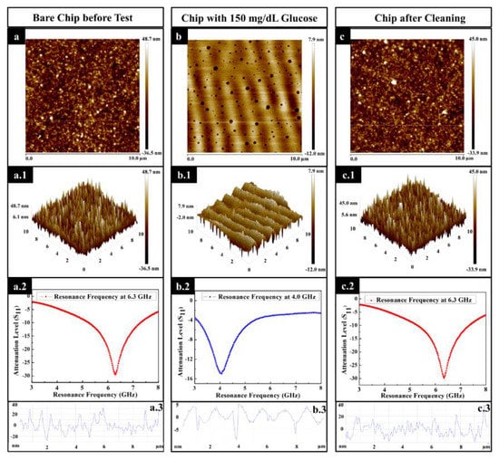 For the purpose of investigating the reusability of the proposed biosensor, the surface morphology of the sensing area of the chip, involving bare chip before test, chip added with 150 mg/dL glucose, and chip after cleaning, were characterized. Figure 6a,a.1,a.2, present the 2D and 3D view of the bare chip with an RMS value of 12.3 nm and a resonance frequency of 6.30 GHz, respectively. When the glucose solution was added to the chip with a concentration of 150 mg/dL, an RMS value of 2.52 nm and a shifted resonance frequency of 4.07 GHz can be achieved, which are shown in Figure 6b,b.1,b.2, respectively. The acquisition of such roughness compared with the bare chip is ascribed to the glucose particles coverage on uneven peaks and valleys of the surface. Interestingly, some cavities and wrinkles appear on the surface of the biosensor as a result of the uneven evaporation rate of the glucose solution. Then, the biosensor is rinsed with PBS and DI water. The RMS value of the biosensor after-cleaning was 11.7 nm (Figure 6c,c.1) and the resonance frequency returned to 6.30 GHz (Figure 6c.2). From another perspective, the surface roughness profiles, before the test (Figure 6a.3) and after cleaning (Figure 6c.3), were found to be similar, which is obviously different from the conditions under the test (Figure 6b.3). The above-discussed results provide a good illustration that there is no chemical immobilization involved for the chip to create a resonance frequency and return the initial value after the test. Therefore, the proposed biosensor has a property of reusability for the future application.
