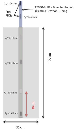 The FBGs used in our implementation have been inscribed by using a continuous wave laser (AzurLightSystem–Sirah laser system) emitting at 244 nm. The method of inscription was based on the Lloyd mirror technique, allowing us to obtain a chain of 6 FBGs at different wavelengths equally distributed along the optical fiber. Four FBGs were glued in the sensing part (the platform), and the two others were left free outside of the sensing region. The length of each FBG was 3 mm, and the reflectivity was around 50%. Figure 2 presents a general view of the sensor pad with the position of the FBGs and the dimension of this platform.