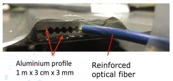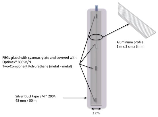 The overall dimensions of the platform allowed for good stability and contact with the soil without being too bulky. This facilitated its transport and positioning on the road without disrupting the traffic or having consequences on the vehicles. Figure 3 is a zoom of the active sensor part with the position of the FBGs. These FBGs were glued inside a groove of an aluminum profile. First of all, the FBGs were fixed in this groove with a small strain (150 µε) using a high-speed curing cyanoacrylate glue and then, a strong two-component glue was used to maintain the optical fiber all along the inside the groove. The same glue was used to fix a second aluminum profile over the first one and therefore to encapsulate the optical fiber, thus ensuring a good protection. Finally, a strong duct tape was used to perfectly maintain the active sensor part on the flat steel plate.