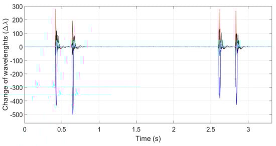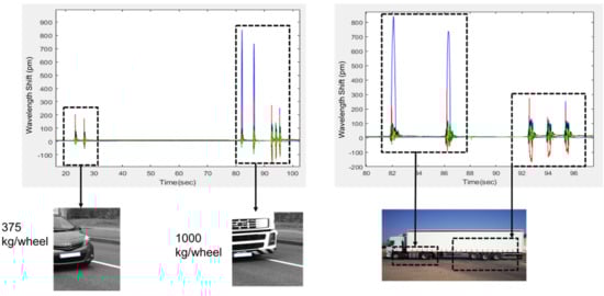 The typical traces measured by using the four FBG strain sensors inside the platform are shown in Figure 7 (the different colors represent the responses of the four FBGs). The passage of two successive cars with an interval of about two seconds between them can be observed in Figure 7. The amount of wavelength shift varies between the FBGs, depending on the position of the wheels.