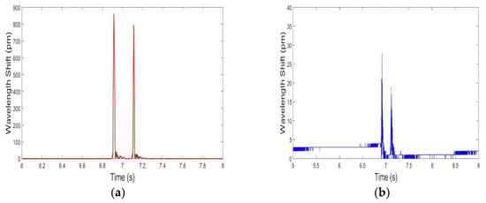 Amplitude of the wavelength shift (for a passage of the same car, circulating at 45 km h−1): (a) of FBG 2 (placed on the road); (b) of FBG 5 (outside of the road). A factor of 32 was measured between two amplitudes (wavelength shifts).