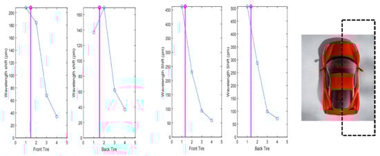 In this part of the experiment, the position of the wheels was successfully traced by comparing the wavelength shifts of four FBG sensors in the platform. As the test drives were organized along straight lines, the front and back tires of the car followed the same trajectory as shown in Figure 9 for two example cases. For each example case, two graphs are given (for the front tire and back tire of the same vehicle and same passage), resulting in four data plots in Figure 9. The integer numbers in the horizontal axis of the graphs represent the number of the FBG in the array (from 1 to 4). When the vehicle passed through the platform, the FBG nearest to the tire position was subject to more strain compared to the others (hence presenting more wavelength shift). Therefore, measuring and plotting the wavelength shifts of the FBGs in this array provided us with information about many aspects of the vehicle’s passage through the platform, such as the tire’s passage position, direction change, and the load distribution of the vehicle.