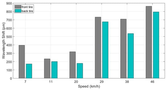 In the final stage of the measurement, several tests were done with the same car passing at the same position with various known speeds. The goal of these tests was to determine the correlation between the speed and the magnitude of the peak wavelength shifts. Figure 10 summarizes the preliminary results for six different speed values. For speed values higher than 20 km h−1, the wavelength shift amplitude considerably increased. The shift in amplitude was always higher for the front tire of the car compared to its back tire. This observation is in agreement with the other experimental work reported in the literature [8] and can be explained by the fact that the weight of the front is always heavier (because of the engine) than that of the rear for a front-wheel-drive vehicle.