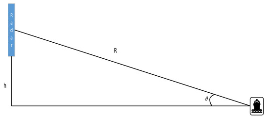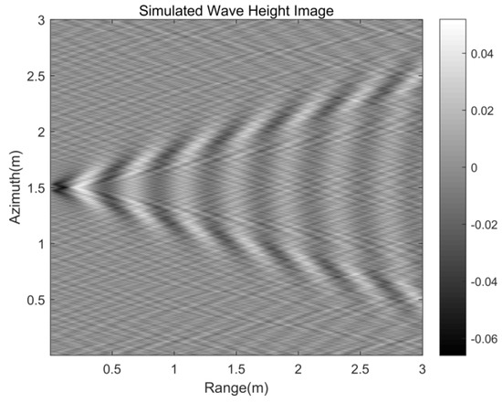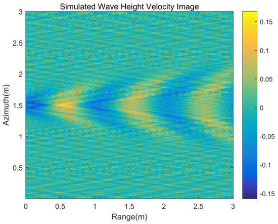 A closed lake was chosen as the experiment area where the current influence is relatively small. The radar was deployed on the shore 1.9 m above the mean lake level. The geometrical diagram of the radar and target is shown in Figure 5. Simultaneously, the anemometer is set on a tower 10 m above the mean lake level to measure the wind velocity. During the experiment, the target motion direction is parallel to the radar array direction as the radar azimuth direction. The target with the ability to generate the Kelvin wake shown in Figure 2 has a velocity of 0.8m/s. Based on the Doppler velocity measurement of MSAR, the ground-based MIMO SAR owns the radial velocity acquisition capability. In order to obtain the velocity of the Kelvin wake compared with the time-varying model, the radial velocity simulation of Kelvin wake is necessary. The radial observation velocity of the Kelvin wake consists of the wave height velocity component and the wake velocity perpendicular to the motion direction component . Therefore, the radial velocity can be expressed as follows: