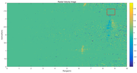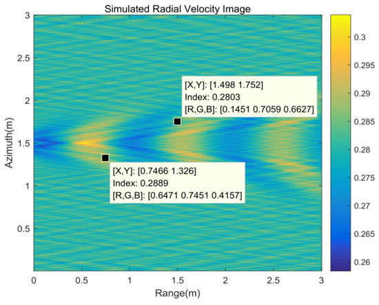 According to the velocity image shown in Figure 12, the Kelvin wake velocity is bound by the wake centerline and the Kelvin wake arms velocities are −0.282 and 0.282 m/s. Positive Doppler velocities represent motion toward the radar. This result is consistent with the theoretical simulation results of the radial velocity in Section 2 with the time-varying model of the Kelvin wake, and the velocity is in the velocity range of the Kelvin arms from 0.2803 to 0.2889 m/s shown in Table 2.