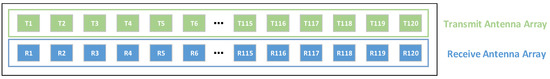 A ground-based MIMO SARat Ka band (34.6 GHz) is exploited as the scattering and velocity observation facility, which consists of the host computer, waveform generation, and a recording device and MIMO antenna, as shown in Figure 4a. The equipment mentioned in this paper is the first millimeter waveradar to achieve imaging through simultaneous switching of transceiver channels. The ground-based MIMO SAR owns higher range and azimuth resolution than the existing ground-based imaging radar mentioned in published articles [14,15,16]. A linear frequency modulation signal is generated by the waveform generation and is saved by recording device. The antenna switching sequence that controls the antenna array is sent by the host computer. The frequency of the antenna switching is determined by the pulse repetition frequency (PRF). On the antenna part, a linear array of transmit antennas with 120 transmit elements and a linear array of receive antennas with 120 receive elements are correspondingly addressed, as shown in Figure 4b, which provides different antenna switching modes. The length of the whole antenna is 280mm and the height is 30 mm. Both transmit antennas and receive antennas are in vertical polarization. Different antenna switching modes can be exploited in a ground-based MIMO SAR, which makes it possible to emulate SAR images with different platform velocities and azimuth sampling densities. One of the most common switching modes with a high resolution will be explained in the next section.