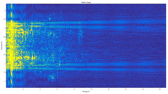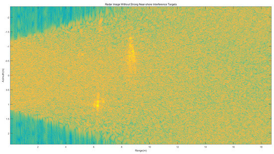 The target moved along the array antenna direction in the experiment with the velocity of 0.8m/s, which was the same as the simulation velocity. The radar image of the static Kelvin wake is shown in Figure 8. With the simple Doppler process, the strong near-shore interference targets with the velocity of 0 m/s were removed, as shown in Figure 9.