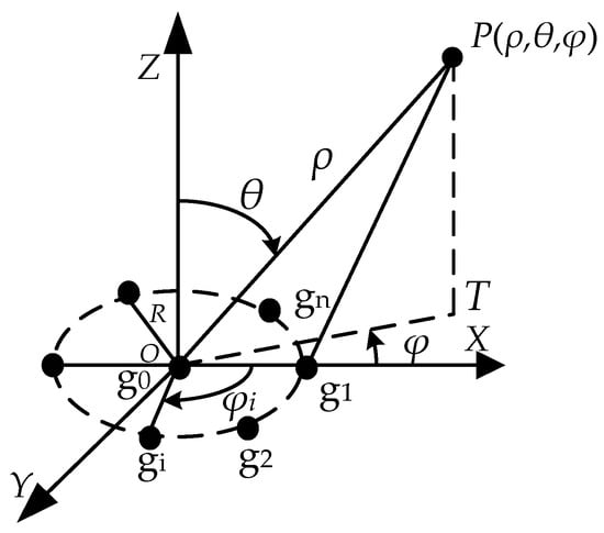 Figure 1 is a schematic diagram of the detector. We set the spherical coordinate system with the center O of the array as the origin. A sensor g0 with a radius r is arranged in the center of the array, and the remaining n sensors g1, g2, …, gn are evenly arranged on the circumference. R is the radius of the array, and the charge amount of the air-charged target P in the air is . The distance from the geometric center of the target to the center of the array is ρ, the azimuth of the target φ is the angle between the projection OT of ρ on the OXY plane and the X axis, the elevation angle θ of the target is the angle between the Z axis and ρ, and the angle between the i sensor and the X axis is φi.