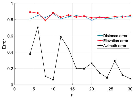 The simulation results are shown in Figure 2, where the abscissa is the number of sensors n on the circumference, and the ordinate is the localization error, which includes: distance error, elevation error, and azimuth error, which are all real numbers. It can be seen from the simulation results that with the increase of n, the value of the distance error and elevation angle error has a small effect, but the effect on the azimuth error has a large effect. Among the results, the distance error only changed from 0.791 to 0.849 and they differed by 0.058, the elevation error changed from 0.790 to 0.8927 and they differed by 0.1027, and the azimuth error changed from 0.0635 to 0.7055 and they differed by 0.642.