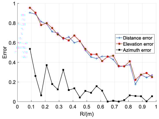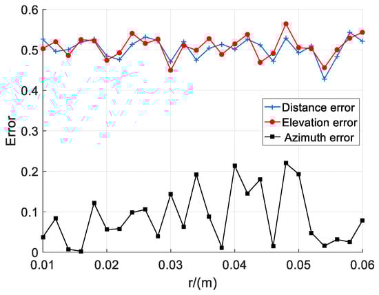 The simulation results are shown in Figure 3, where the abscissa is the array radius R and the ordinate is the localization error. From the simulation results, it can be seen that with the increase of R, the values of the distance error, elevation error, and azimuth error have a greater impact. Among them, the distance error changed from 0.9050 to 0.1770 and they differed by 0.728, the elevation error changed from 0.9547 to 0.2230 and they differed by 0.7317, and the azimuth error changed from 0.5377 to 0.0020 and they differed by 0.5177. It can also be seen from Figure 3 that the localization error decreases as the array radius increases.