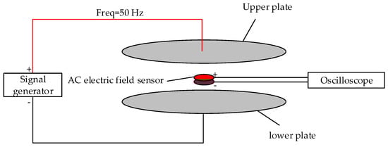 Among them, in order to have a feasible solution to the objective function, the value of the minimum induced charge amount needs to be known in advance. For this reason, the following experiments are designed in this paper. The AC voltage with a frequency of Freq = 50 Hz is generated by the signal generator and applied to the upper plates of the calibration device with a distance of d = 3.2. The lower plate is connected to the low of the signal generator. In this way, a uniform 50 Hz electric field with controllable amplitude can be generated. Then, the positive and negative ends of the capacitive electric field sensor without a conditioning circuit are connected through an oscilloscope and the waveform is displayed. Finally, observe the change of the oscilloscope waveform to get the minimum induced charge of the sensor. The block diagram of the experimental platform is shown in Figure 5.