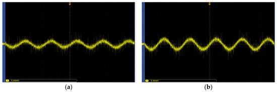 The test results are shown in Figure 6, where the abscissa is time and the ordinate is voltage amplitude. Figure 6a shows the waveform when the field strength is 0 to 31.3 V/m. During the process of gradually increasing the voltage, it is found that the waveform remains basically unchanged in this field strength range. Figure 6b shows the waveform when the field strength is directly increased from 31.3 to 62.5 V/m. It can be seen that the amplitude of the waveform has been significantly enhanced. The experimental results show that the sensor can respond when the applied uniform field strength is 62.5 V/m. Therefore, the induced charge calculated based on of 1.3 × 10−12 C can be used as the minimum induced charge of the sensor designed in this paper. The sensor is a circular plate capacitive sensor with a radius of 1 cm.