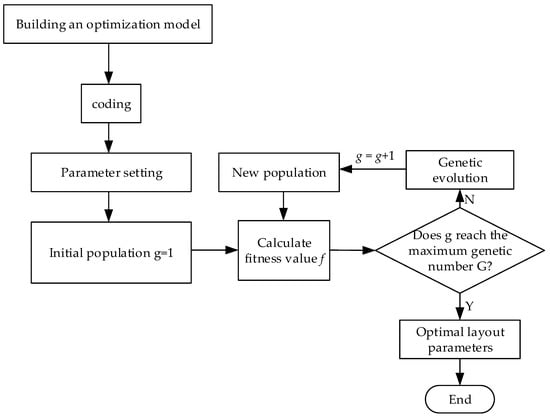 - Initialize the population. The optimization of the layout parameters in this article belongs to a more complicated optimization problem. Therefore, the number of the initial population is set to 200, and the current generation number is g = 1.