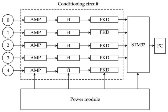 The circuit block diagram of the detector is shown in Figure 8. The induction plate of the electric field sensor will generate an induced charge that changes with the frequency of the electric field in the electric field. The induced charge is converted into a voltage signal by for measurement. At this time, the voltage signal collected by the sensor is very weak, usually millivolt level, so it needs to be amplified by the amplifier circuit in the conditioning circuit. The amplified signal has not only the 50 Hz power–frequency signal, but also the noise of other components, so it is necessary to filter the signals of other components through a filter circuit (fl). The rectified signal is a standard sine wave. The filtered signal is converted into a DC signal by a peak detection circuit (PKD). The DC signal is transmitted to the STM32 processor for subsequent operations.