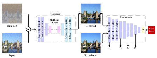 - GAN is proposed to de-rain the rainy image. Squeeze-and-Exciation (SE) modules are used in generative network. Instance normalization (IN) [14] is used to normalize the features. The trainable perceptual loss function is used to guide the network to generate rain-free image which is close to real-world rain-free image semantically.