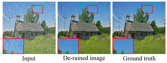 An example of rain residue after de-raining. It can be seen that the zoomed area still has rain residue which should be refined.