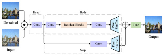 The REN and GAN models can accomplish locating and removing rain streaks tasks. Although the de-rained images from the generator show impressive performance in [13], the rain residue still can be found in heavy rain conditions, as shown in Figure 5. Previous studies usually ignore the refinement or only have a coarse refinement part with two convolution layers [6]. Thus, RFN is proposed to restore the image details. As shown in Figure 6, it consists of skip, body, and head parts. The de-rained image of generator and rainy input image are concatenated as the input of RFN. The reason is that after the processing of generator, some origin details have been lost. The refinement part cannot restore the lost details without any information. To reduce the computation overhead, a stride-convolution layer is applied to down-sample the image. The head part is a convolution layer with IN and ReLU. The body part is a series of improved residual blocks [25]. A residual block can be written as . If x is optimal, the network only needs to fit which much easier than fitting . Followed by residual blocks, a pixelshuffle [26] layer is adopted. The skip part consists of a convolution layer and a pixelshuffle layer. The output of skip and body are concatenated in channel dimension. Then a Tanh activation function is applied to map the output to . The architecture is adopted from [25].