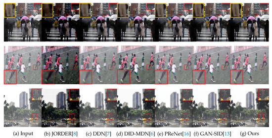 To verify the effectiveness of the proposed method, visual comparison on DID-MDN dataset is listed in Figure 9. From the figure, it can be seen that the proposed method performs better on metrics of SSIM/PSNR. We can also see that the color information is destroyed and dark speckle is got in JORDER [8] due to using Koschmieder model [37]. DDN [7] can remove most of the rain streaks, but rain residue still can be observed in heavy rain condition due to adding the inaccurate negative residual map and input image directly without refinement. Compared with DDN, DID-MDN [6] has some improvements and is able to get a rain-free result by using a predicted label to guide the process of de-raining. However, slight blur still can be observed, since the label is only the approximation of the actual distribution of rain streaks. PReNet [16] can achieve a good performance on medium and light rain conditions, but the phenomenon of blur still exists in heavy rain condition. Our previous work GAN-SID [13] works well at almost all kinds of rain conditions due to replacing the BN by IN in GAN model. Compared with GAN-SID, the proposed IGAN-SID can further improve the quality of de-rained image because it can estimate the actual distribution of rain streaks and refine details by using REN and RFN respectively.
